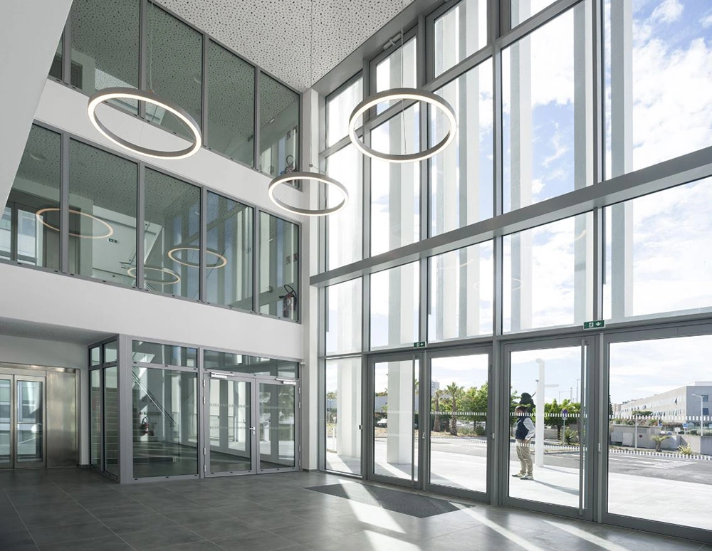 Choix techniques : Salle serveurs protégée du risque incendie par système de détection et extinction par gaz interne, interconnexion VDI haute, disponibilité avec les autres bâtiments du site (rocades par fibre optique, monomode/multimode et rocades par cuivre), alimentation CFO sécurisée par onduleur rackable à chaud et par groupe électrogène, climatisation, équipements sûreté (contrôle d’accès, vidéosurveillance), remontées d’alarmes techniques par GTB, distributions par faux planchers techniques.